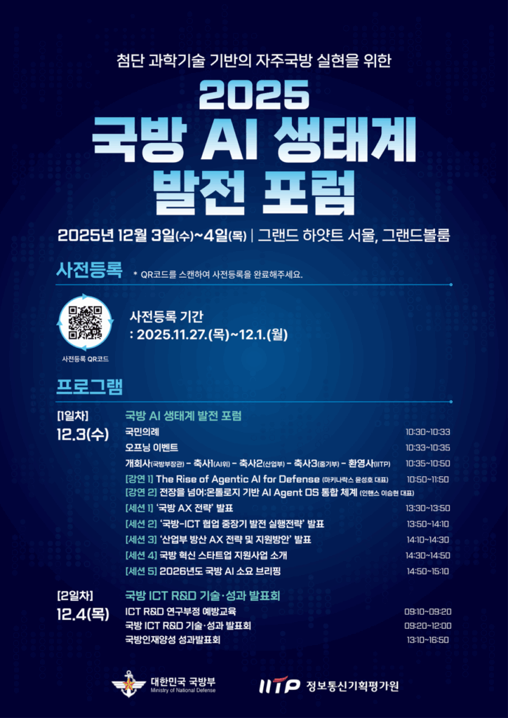 2025 국방 AI 생태계 발전 포럼 행사가 12월3일~4일, 그랜드 하얏트 서울에게 개최됩니다. 아래 이미지 QR을 통해 사전등록하시기 바랍니다. * 본 행사는 2026년 AX 스프린트 사업 설명회도 겸하는 행사입니다.